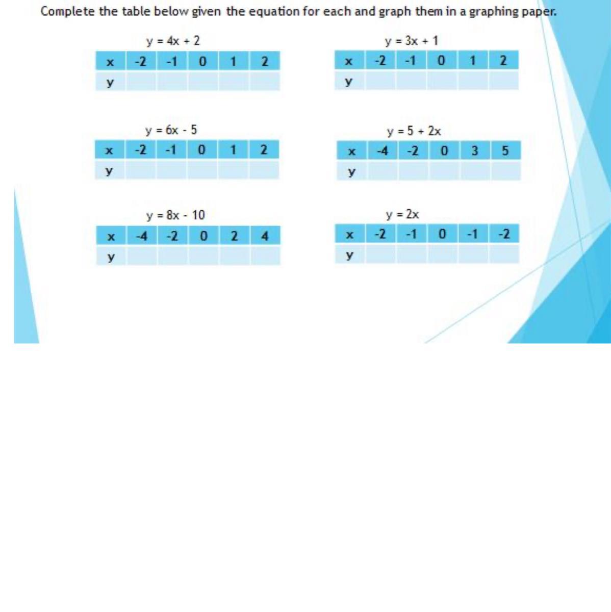 To find the first table y = 4x + 2, to find each y value we have to substitute each x value into the equation.