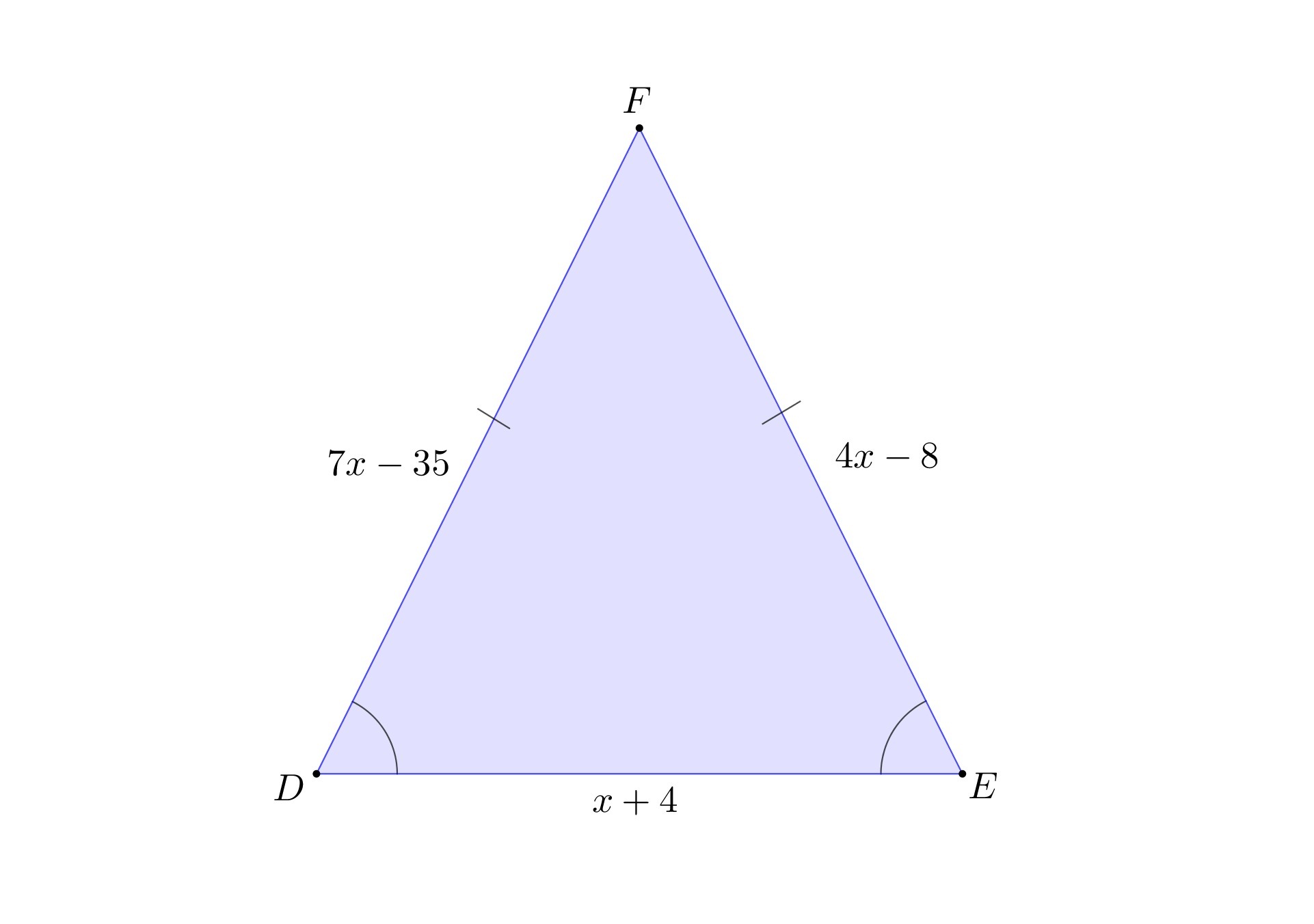 DE = x + 4, EF = 4x - 8, DF = 7x - 35
