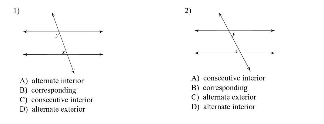 Identify each pair of angles as corresponding, alternate interior, alternate exterior, or consecutive interior.