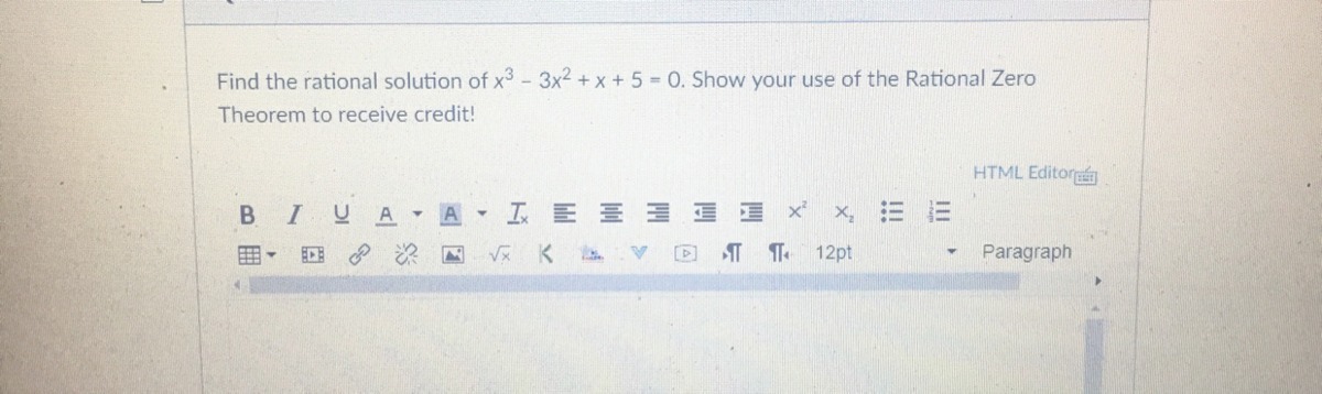 Find the rational solution of x^3-3x^2+x+5=0. Show your use of the rational zero theorem to receive credit.