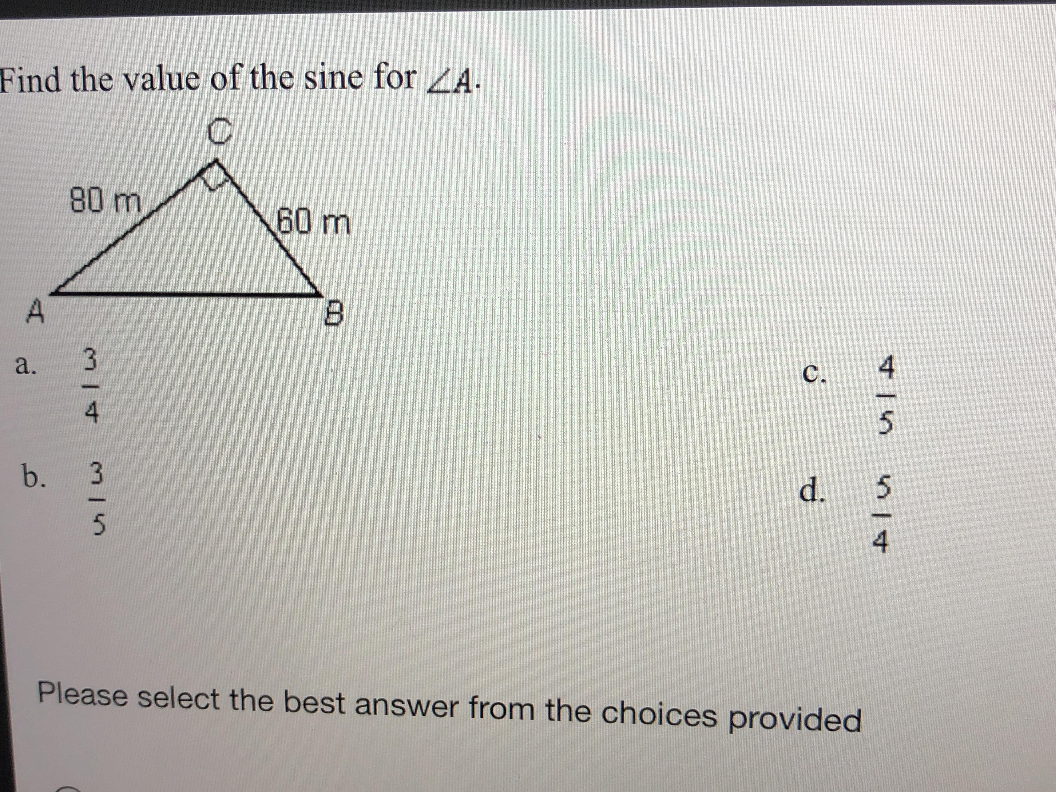 Sine equals opposite over hypotenuse. In this case CB (60) is the opposite and AB (100) is the hypotenuse.