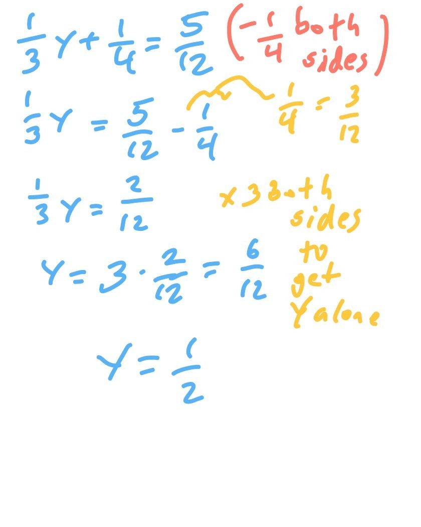 both start out the same, just remember what you do to one side you have to do to the other, so subtract both sides by 1/4, then you want to get y alone, so either divide or multiply the 3 on both sides! let me know which it is and I can help you out more