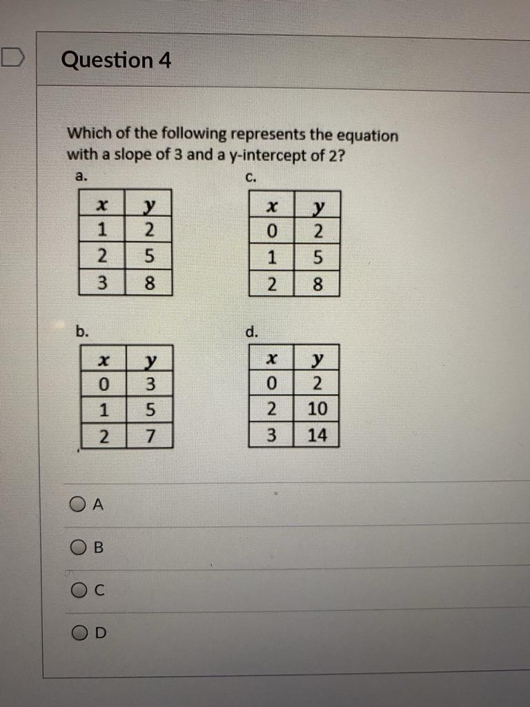 Which of the following represents the equation with a slope of 3 and a y-intercept of 2?