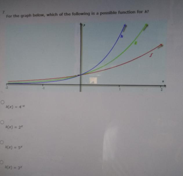 h(x) is shown on the graph as having the highest rate of growth. That means, relative to the other functions, the base of the exponential is larger. Of the choices offered, the one with the largest growth factor is ...