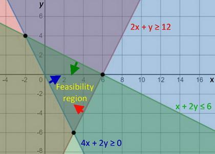 \text{Constraints} = \begin{cases}(a)\qquad 2x - y  & \leq 12\\(b)\qquad 4x+ 2y & \geq 0\\(c) \qquad x + 2y  & \leq 6\\ \end{cases}
