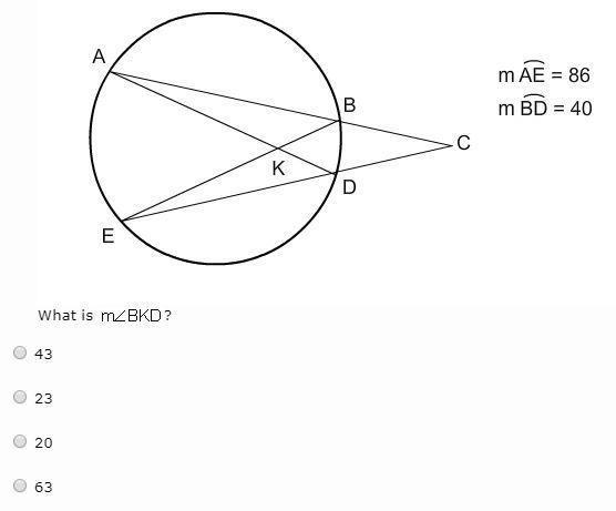 m\angle BKD=\dfrac{AE+BD}{2}\\\\m\angle BKD=\dfrac{86+40}{2}\\\\m\angle BKD=\dfrac{126}{2}\\\\m\angle BKD=63^\circ