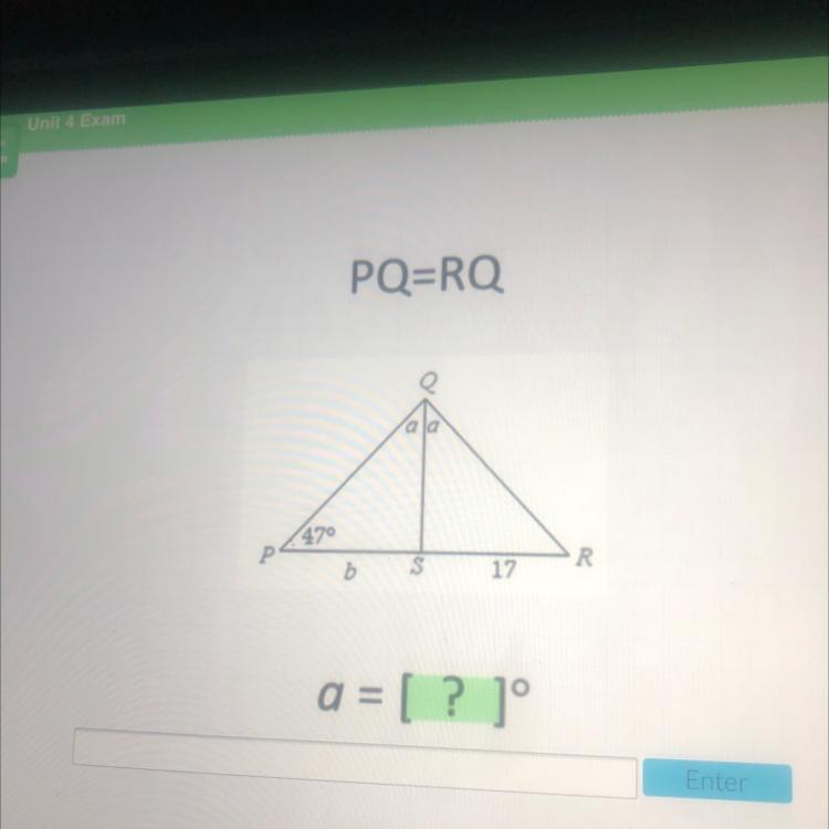 Since PQ = RQ then Δ PQR is isosceles and the base angles are congruent, that is both 47° , thus