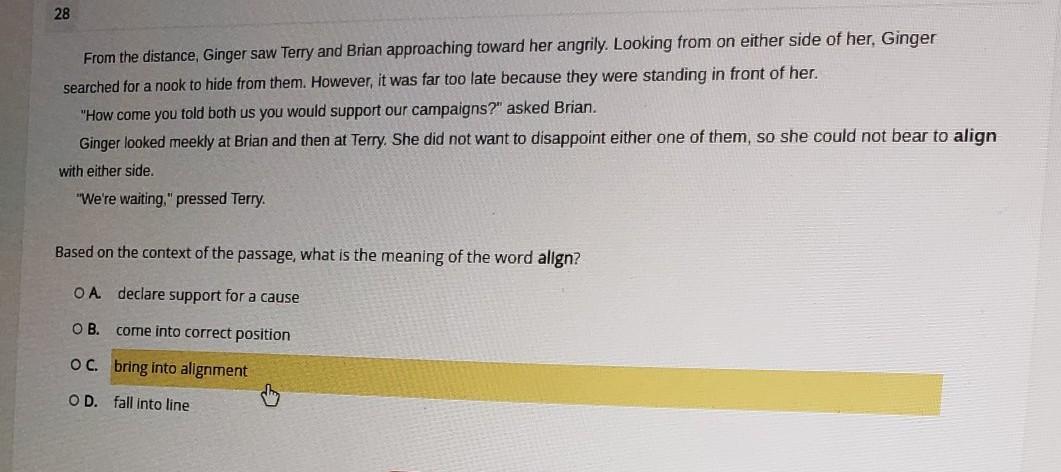 A- all of these are definitions of the word ‘align,’ so you have to look at the context. the characters are discussing supporting their campaigns, in which ginger would ‘declare support’ to. none of the other definitions would fit.