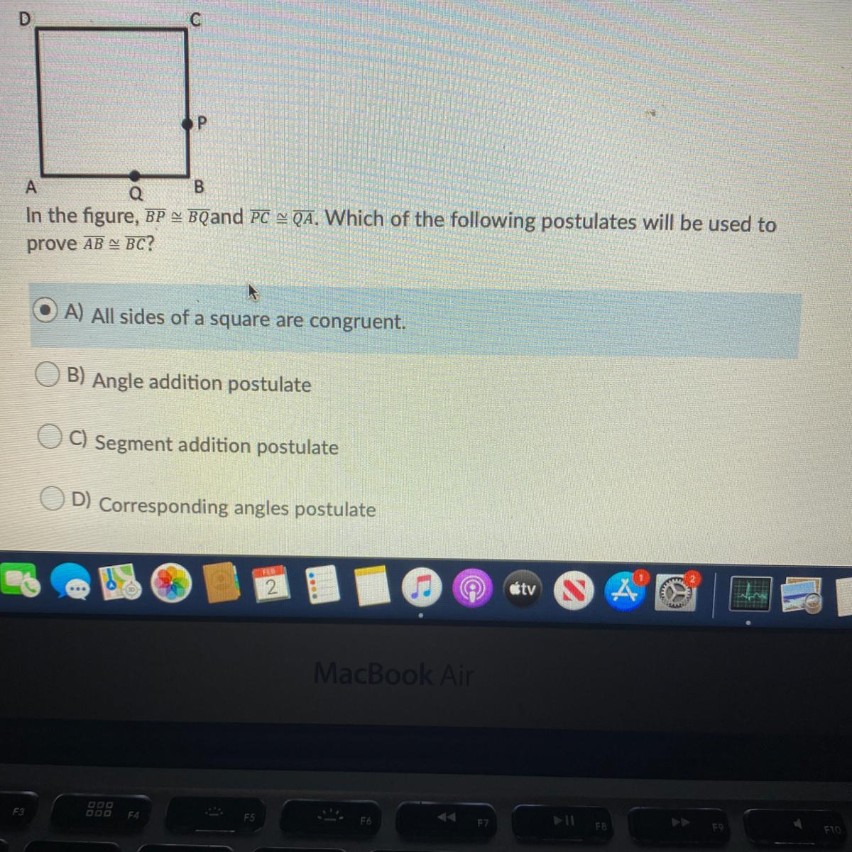 In the figure, BP = BQ and PC = QA. Which of the following postulates prove AB = BC?