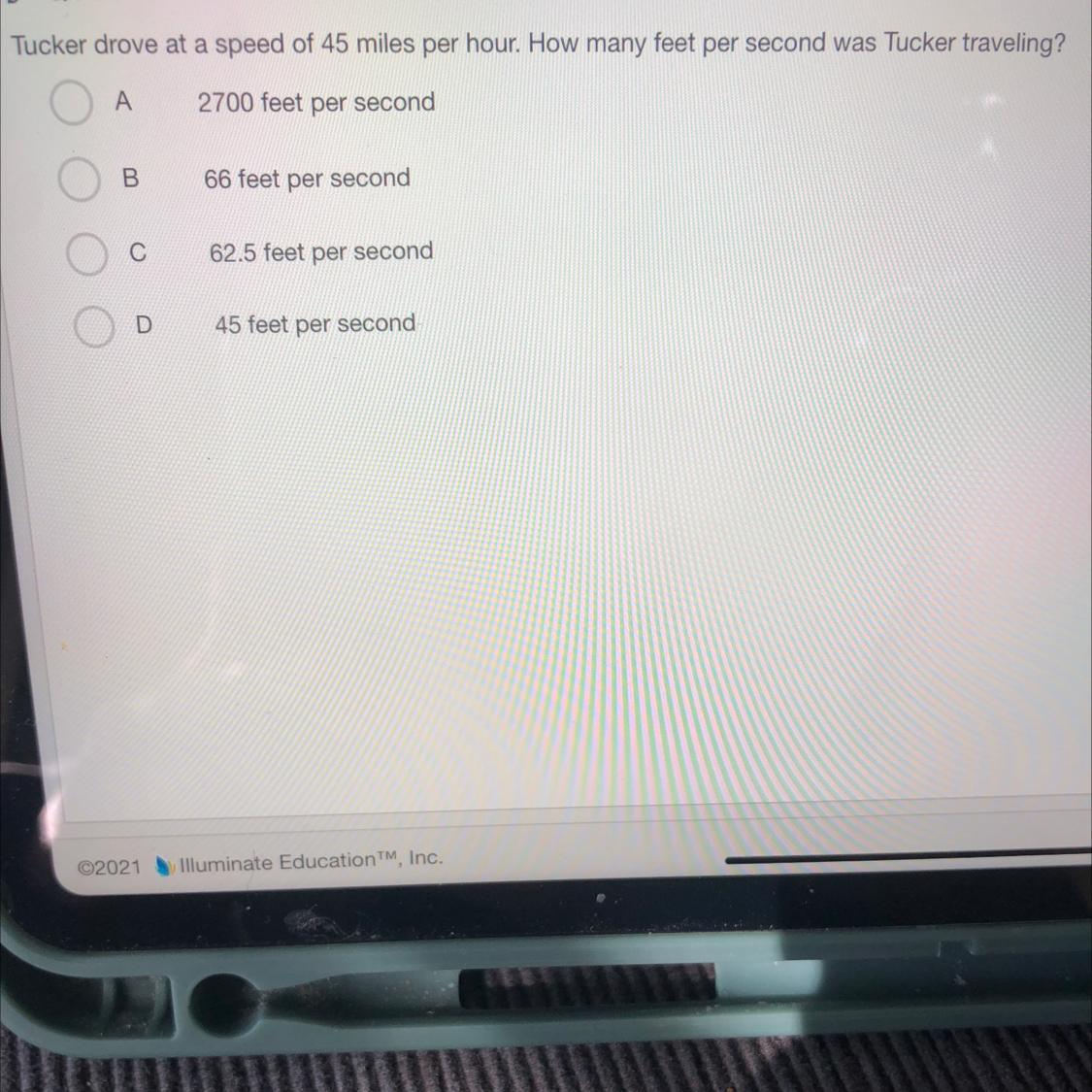\frac{45 miles}{1 hour} x \frac{1 hour}{3600 seconds} x \frac{5280 feet}{1 mile} = \frac{237600}{3600} = 66 feet per seconds