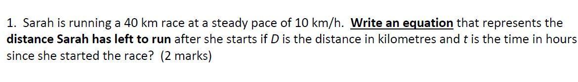 y = mx + b is the equation of a line in slope intercept form. We'll be using this equation since the slope, or distance traveled, is steady (linear). In this case, the slope is 10 since Sarah's pace is 10 km/hr. m is the slope, so m = 10.