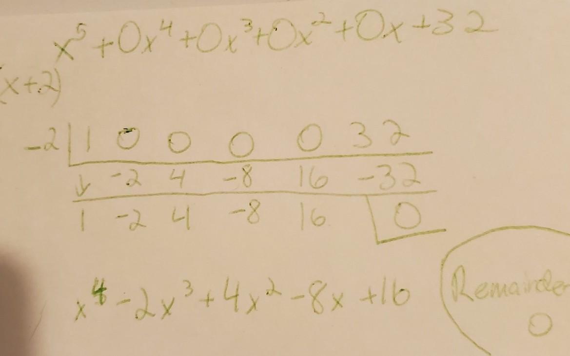 When dividing a polynomial by a zero, you first want to find the zero to divide by. Solving the zero (x+2) will give us the value of x to divide by. Subtracting 2 from each side gives us x=-2. Then, we write out the full polynomial. Since the only degrees that have numerical values are x^5 and 32, we substitute zero for the values in between (0x^4, 0x^3, 0x^2, and 0x). Then we follow the steps of synthetic division (as seen in the photo) to find our new values for our new equation.