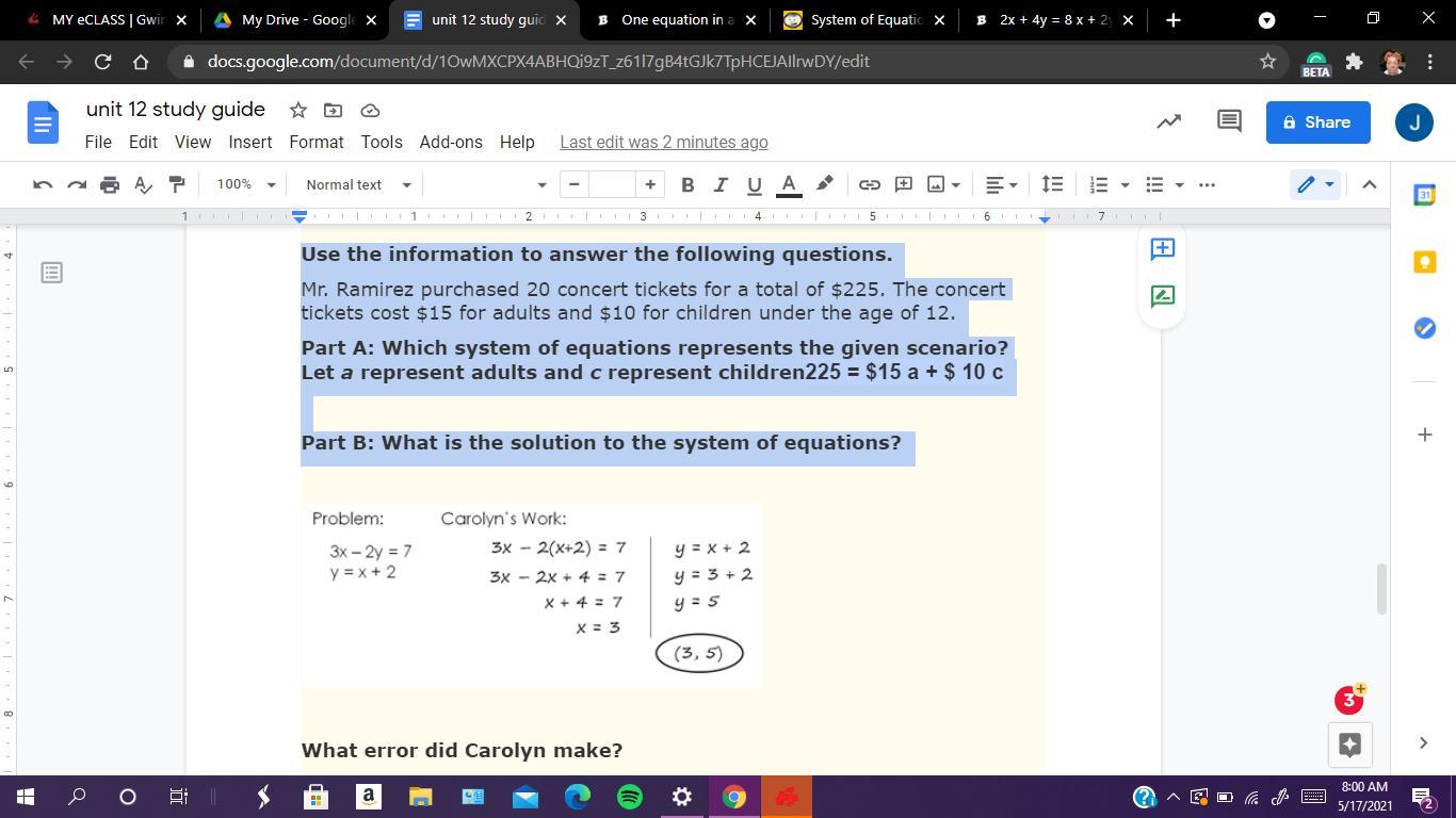 a + c = 20, using this, we know that c = 20 - a, we can substitute this for c in 225 = 15a + 10c to get: