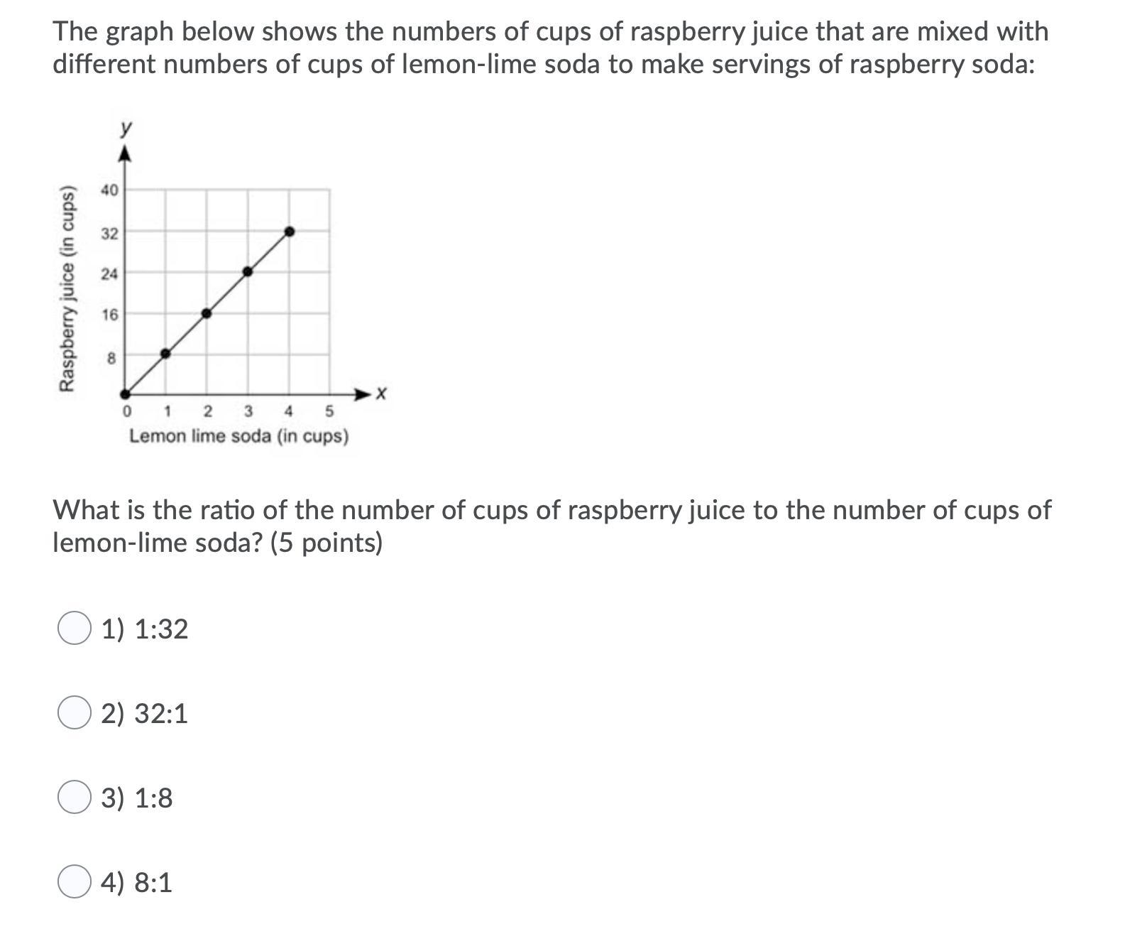 well on the first perfect point there are 8 cups of raspberry juice and 1 cup of lemon-lime soda and it is comparing them in that order so since 1 is the unit it would be 8:1