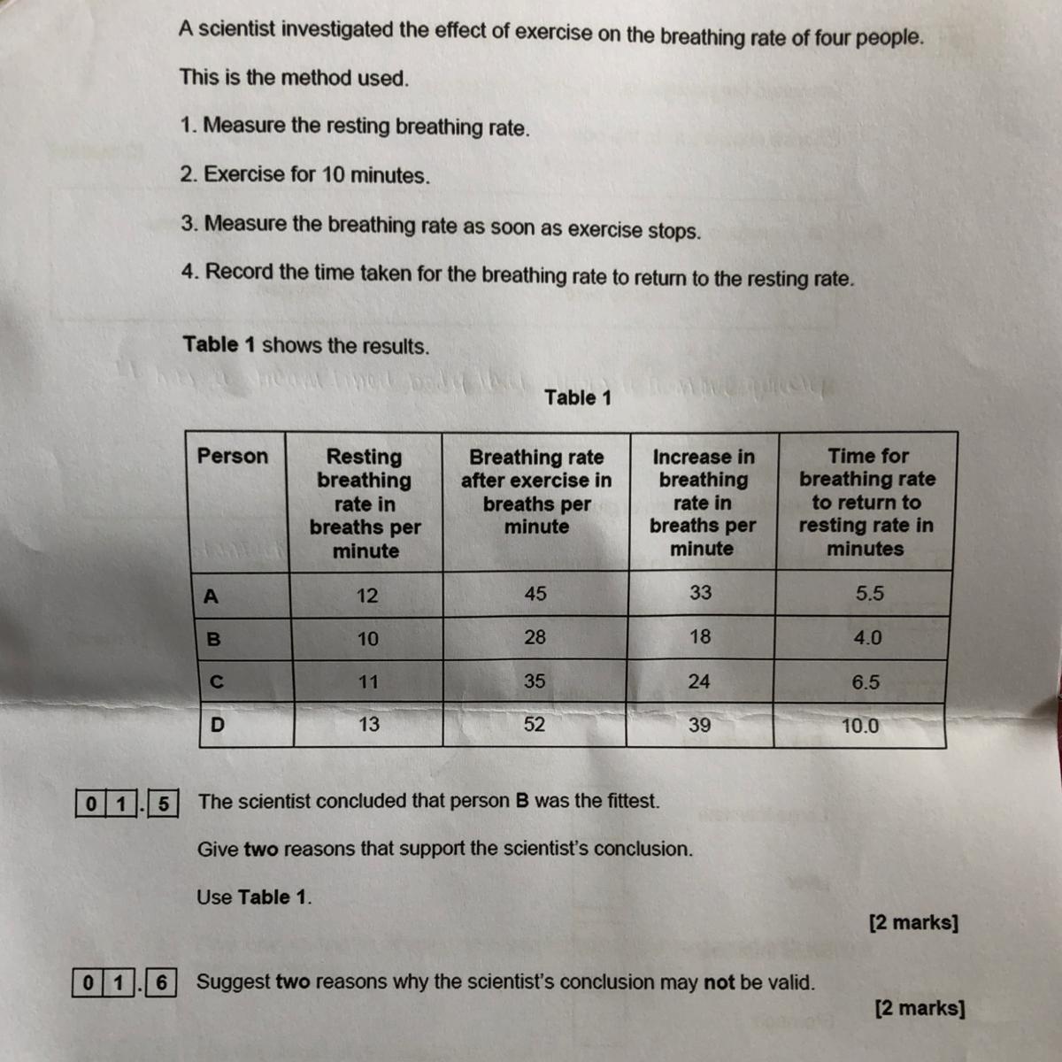 To back up the scientist, when a person is more fit, their breathing will return to a normal rate faster than average, as B's rate returned faster than everyone else's, they are more fit.