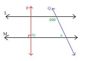 Another way to solve for x is to look at the quadrilateral formed by the lines P and Q with L and M. The interior angles of a quadrilateral add up to 360 degrees. We know 6y = 90 degrees, and the angle above is is also 90, because L&M are parallel and P is perpendicular to them.