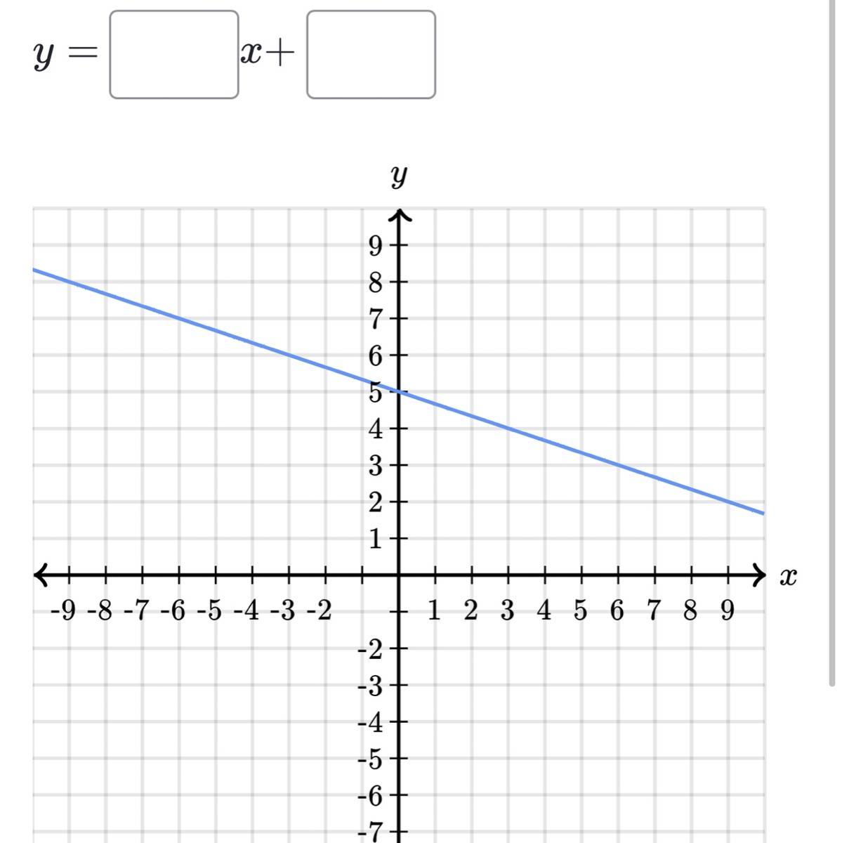 This question is asking for slope-intercept form which is y=mx+b, where m is the slope and b is the y-intercept. First, find the slope; this can be done in two ways, counting change in y and x then dividing, or using the formula . Either way for this graph the slope comes out as -1/3. Next, find the y-intercept, this is where the line intersects with the y-axis. In this case, the line touches the axis at 5, therefore 5 is the value of b.