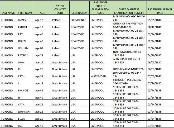 Pat (40), Hellen (40) and William (9) arrived in the US on February 24th, 1847. From the information listed on the document, you might say it was the first family on the USA, originally from Ireland, with Furlong surname.