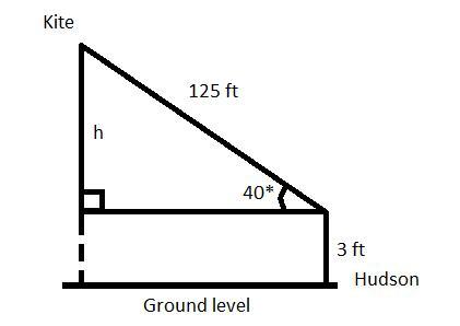 We have been given that Hudson (3 feet tall) is on the beach flying a kite. His angle of elevation looking up to the kite is 40 degrees. The kite string is 125 ft long.