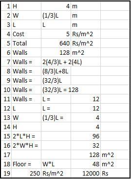 H = 4m and W = (1/3)L. The total cost of 640 Rs/m^2 is divided by the rate cost of Rs 5/m^2 to give 128 m^2 that was plastered. The total area of the walls must be 128 m^2, so then calculate the total wall area: The walls for the length are 2*LH and for the width are 2*WH. Substituting, we have a total of 8*L + (4/3)L = 128 m^2. Solve for L to obtain L = 12m. W is 1/3L, or 4m. The room is (W,L,H) 4, 12, and 4 meters. The floor is W*L, or 48m^2. At Rs 250/m^2, the rug will cost Rs 12000. Ouch.