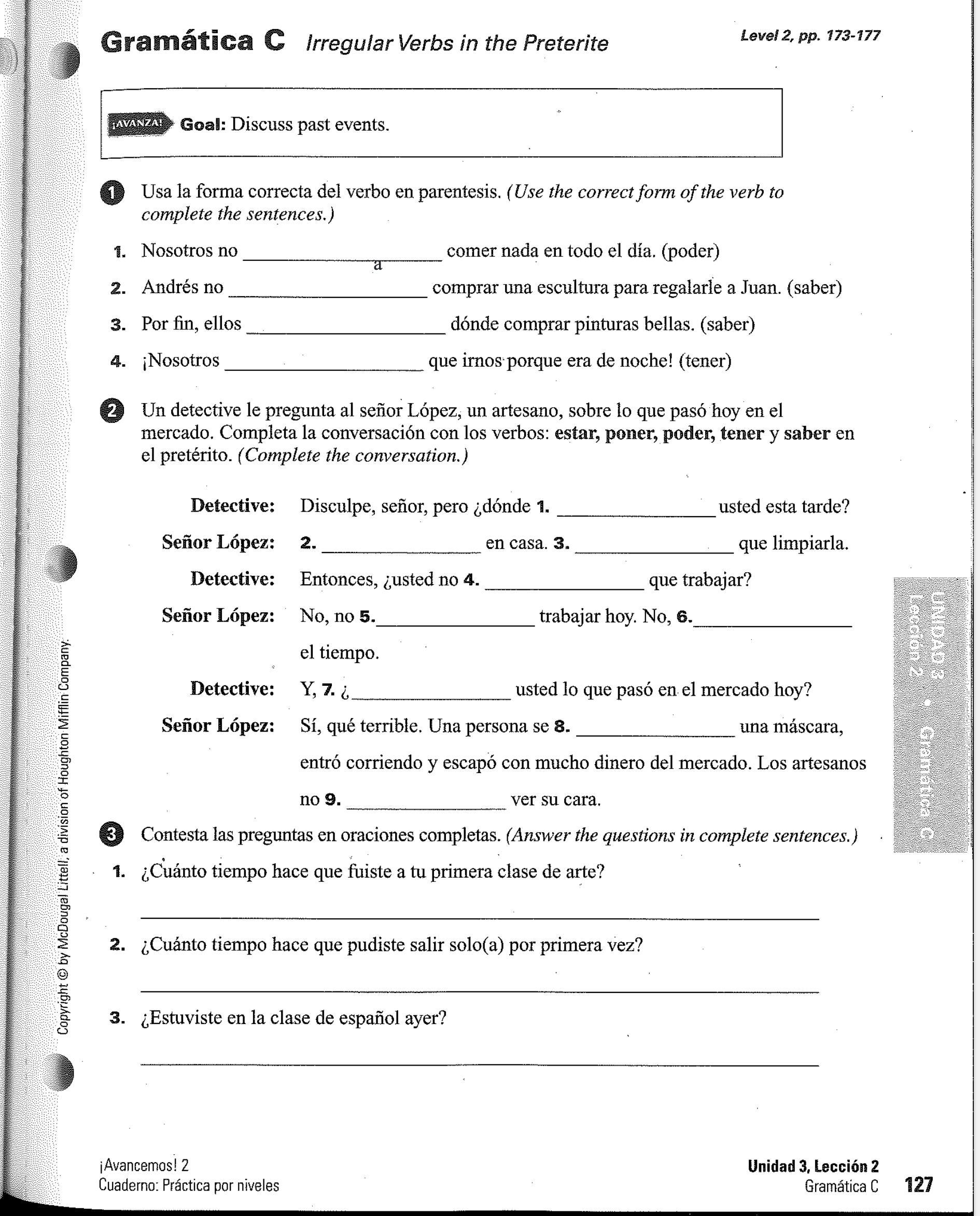 (1) 1 podemos 2 sabe 3 saben 4 tuvimos (2) 1 estará 2 estaré 3 tengo 4 tiene 5 podré 6 tendré 7 sabe 8 puso 9 pudieron (3) 1 fui ami primera clase de arte hace dos semanas. 2 pude salir solo hace cuatro meses. 3 ayer estuve en la clase de español.