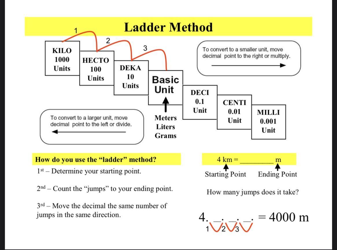 Using the metric units kilometer (km) and meter (m), as seen in the picture of the ladder method example. So, the answer would be 14km = 14000m