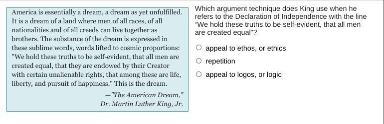 Which argument technique does King use when he refers to the Declaration of Independence with the line “We hold these truths to be self-evident, that all men are created equal”?