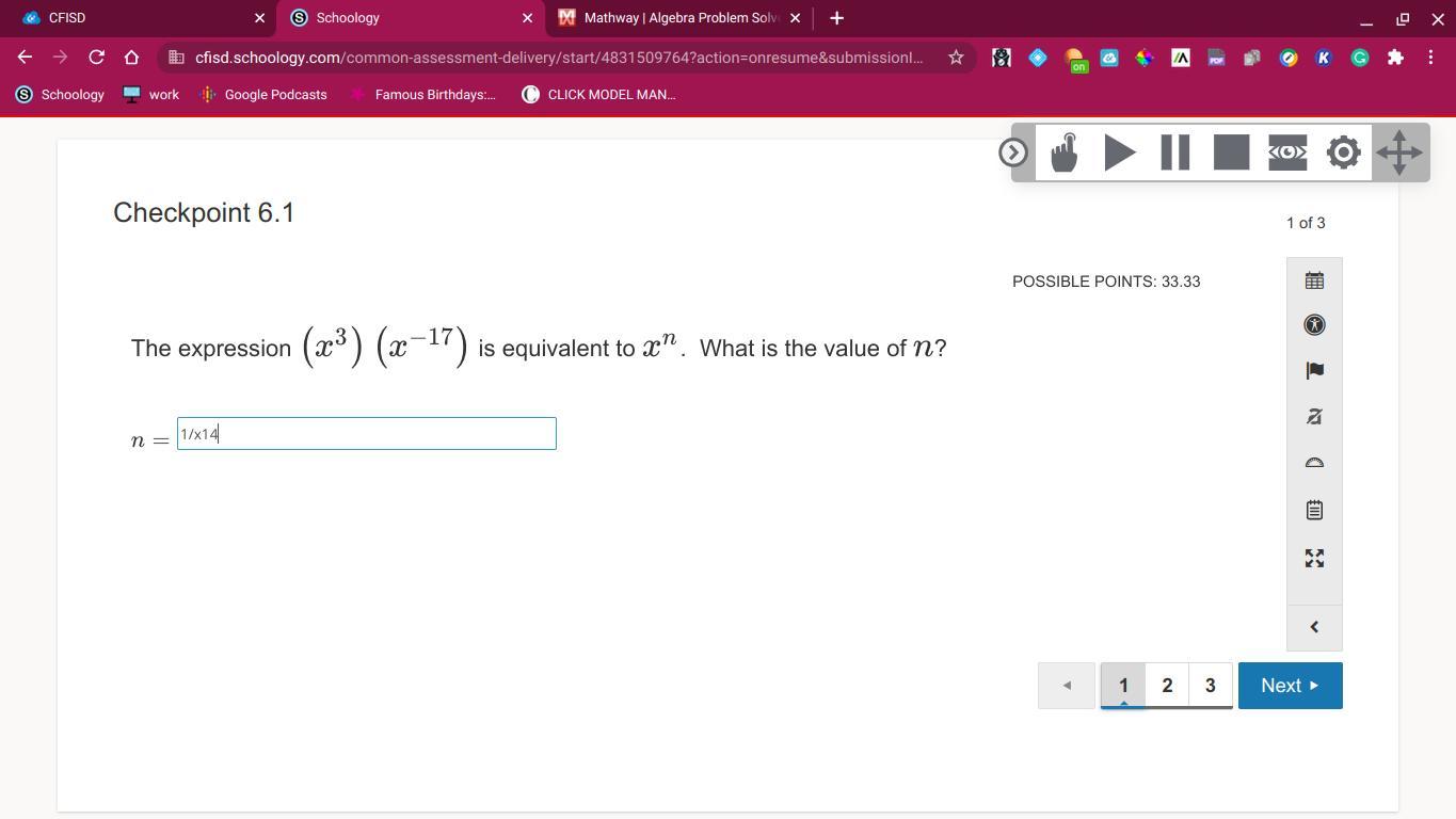 x^{3+(-17)}=x^n ⇔ Adding Exponents Together