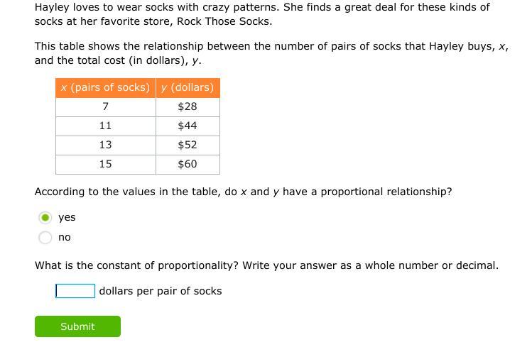 You already determined that x and y have a proportional relationship, as y is four times the x value. Therefore, when x is 1, that means one pair of socks will be four dollars.