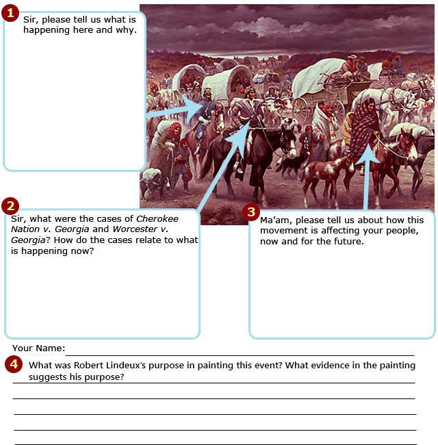 Robert Lindneux created this painting to show the struggle the Native Americans had to deal with as they were forced to leave their homelands because of Andrew Jackson's Indian Removal Act. It was meant to express the crowded migration they had to deal with, and the unsanitary, non-idealistic conditions as they headed away from their heritage and homes. If you were to look closely and carefully at the painting, you can tell that Lindneux had exaggerated and purposefully made the faces on the characters in the painting sorrowful and depressed. The conditions were exaggerated as well, notice the people having to walk and carry sacks on their backs, and people crouching over in their cloaks avoiding the sand and dust. The environment is exaggerated as well and in the landscape you can see dark, stormy clouds, meaning a bad/ dark/ depressing mood. Along with a dusty, windy ground that is surely irritating the Natives' eyes.