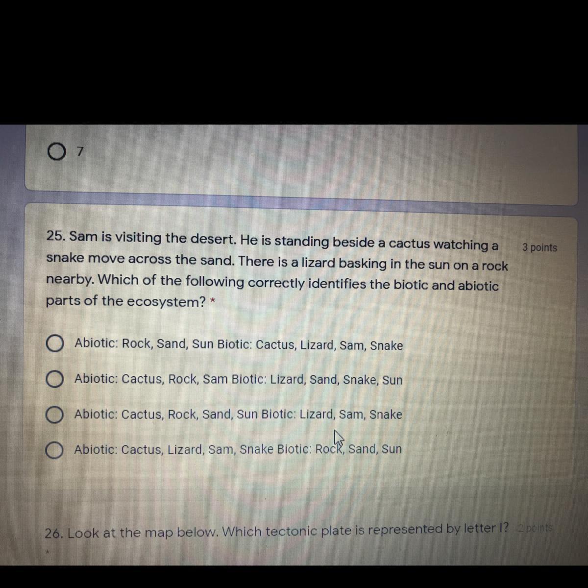 Rock sand sun arent living.  cactus lizard sam and snake are living or biotic