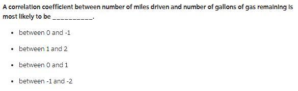 A correlation coefficient between number of miles driven and number of gallons of gas remaining is most likely to be 0 to -1.