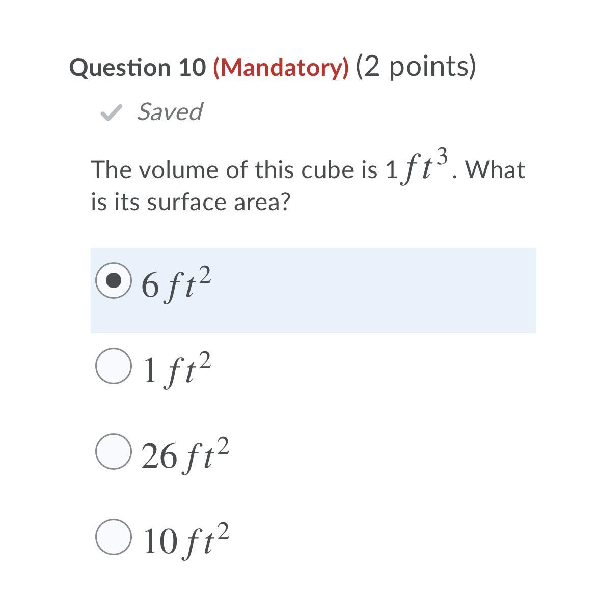 Now we know the side lengths the area of 1 face is 1ft*1ft=1ft^2