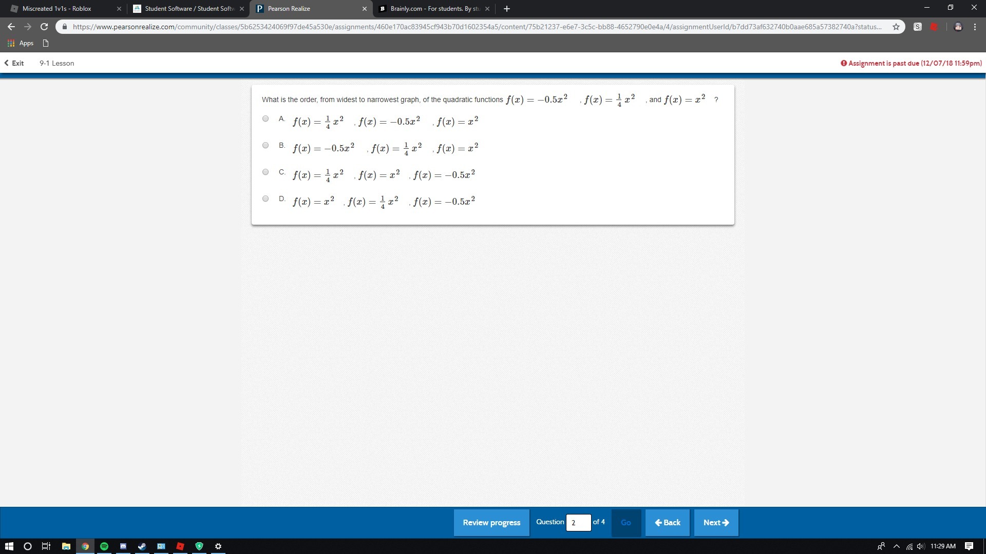 That is why the order from widest to narrowest is f(x) = (1/4)x^2, f(x) = -0.5x^2, f(x) = x^2