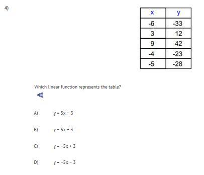 A) y=5x-3 (plug in -6 in place of x and see if you get -33. Do the same for 3,9,-4,-5)