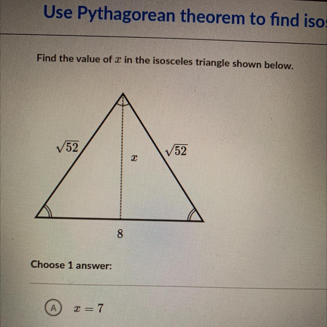Find the value of x in the isosceles triangle shown below. 52 V52 2