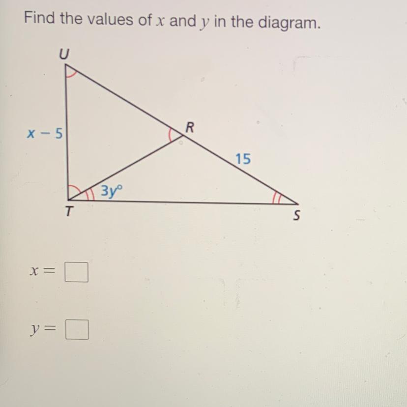 that means that angles T and S (which are both 3y°) plus angle R equal 180 so you can set up this equation to find y: 120 +6y = 180