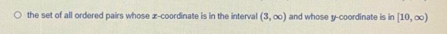 You will also note that y is dependent on x. That is, one cannot pick a value of y greater than 10 independently of the value of x. In that sense, the solution is not "the set of all ordered pairs such that [x and y have independent limits]". Rather, it is the set of all ordered pairs such that √(y -1) ≥ x > 3.