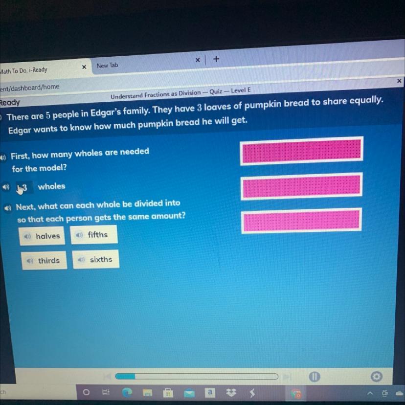 I believe it is fifths since there are 5 people in the family, each person can get 3/5 of the pumpkin bread making it equal with nothing left over.