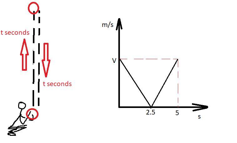 Ball rises and falls in equal periods. Because it goes by same speeds and same route. Therefore t_{rise} = t_{fall} =2.5 s