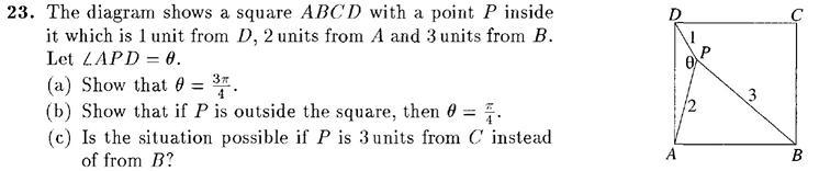 Answer: The diagram shows a square ABCD with a point inside it which is 1 unit from D, 2 units from A and 3 units from B. Let angle APD= theta . (a) Show that theta = (3pi)/4 (b Show that if P is outside the square , then theta = pi/4 () Is the situation possible if P is 3 units from C instead of from B?
