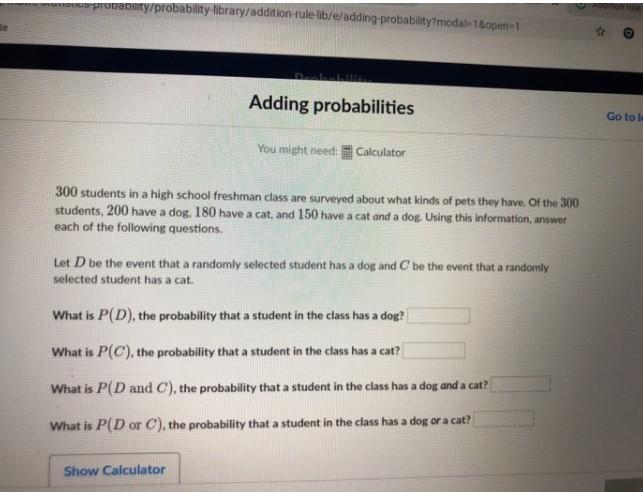 300 students in a high school freshman class are surveyed about what kinds of pets they have. Of the 300 students, 200 have a dog, 180 have a cat, and 150 have a cat and a dog. Using this information, answer each of the following questions, Let D be the event that a randomly selected student has a dog and C be the event that a randomly selected student has a cat.