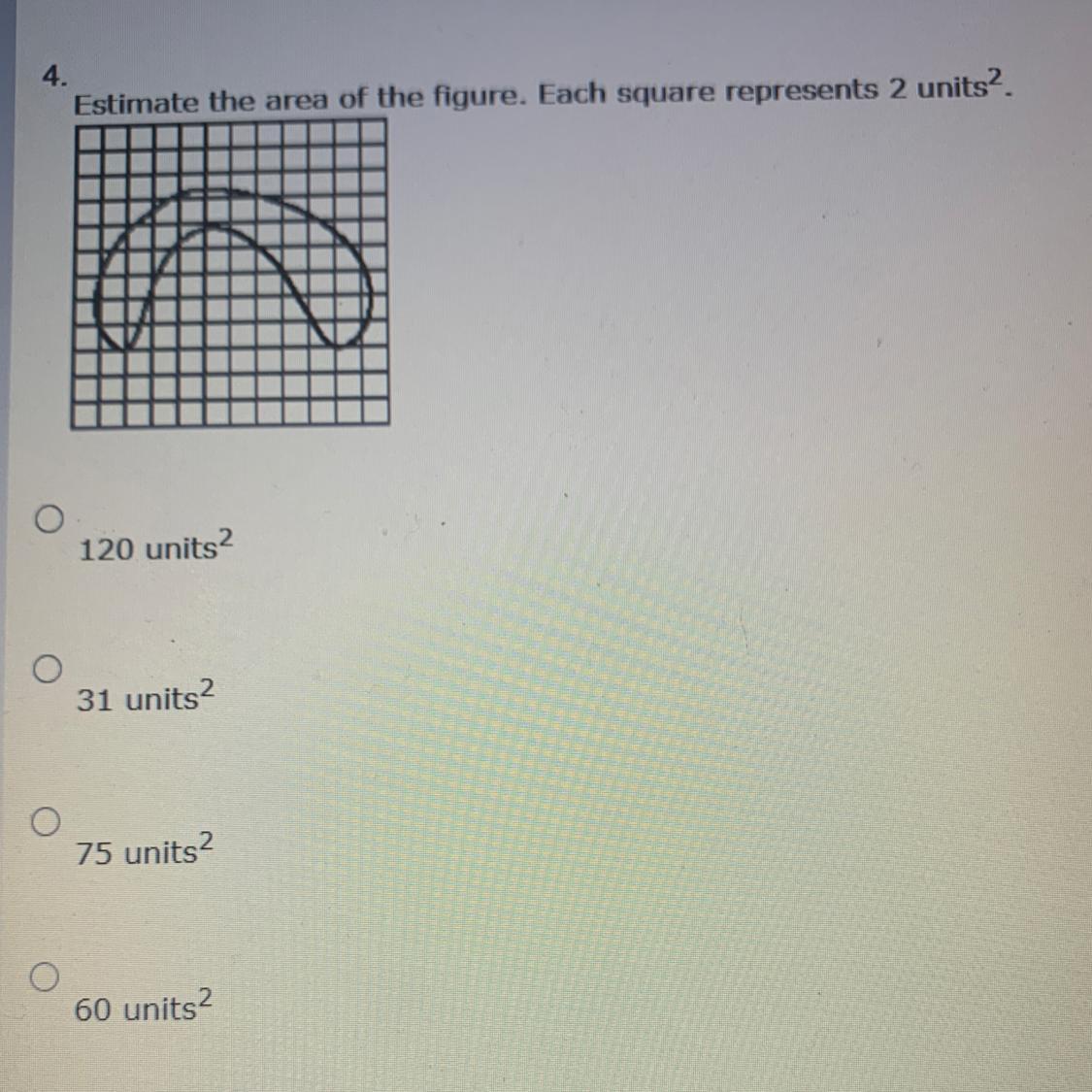 Estimate the area of the figure. Each square represents 2 units^2.