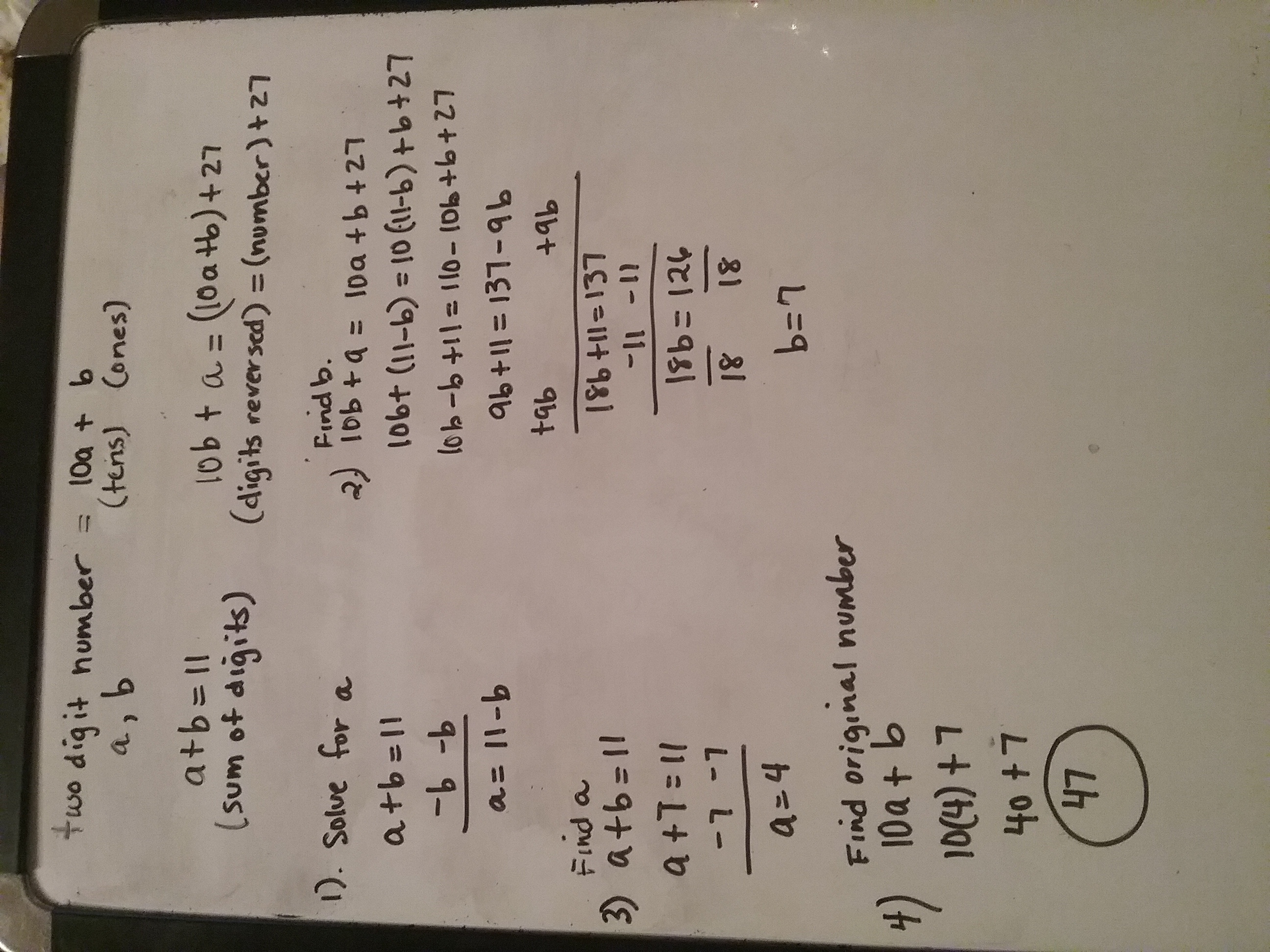 The sum of the digits of a two-digit number is 11. when the digits are reversed, the number increases by 27. find the original number.
