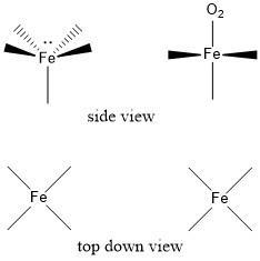Iron is one of the atoms that can form hybrid orbitals using its d-shell electrons, which allows for a greater number of sigma bonds than just four. When iron is only bound to protein, it forms five sigma bonds with one lone pair. The iron atom is pulled down below the central square plane due to one of the bonds with the hemoglobin protein. The thick lines indicate bonds pointing out of the screen, while dashed lines indicate bonds pointing into the screen, so as to suggest 3-D structure.