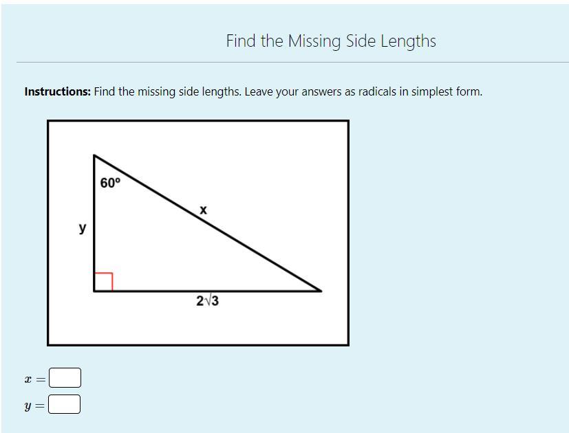 The length 2 √3 faces the angle given and is called the opposite