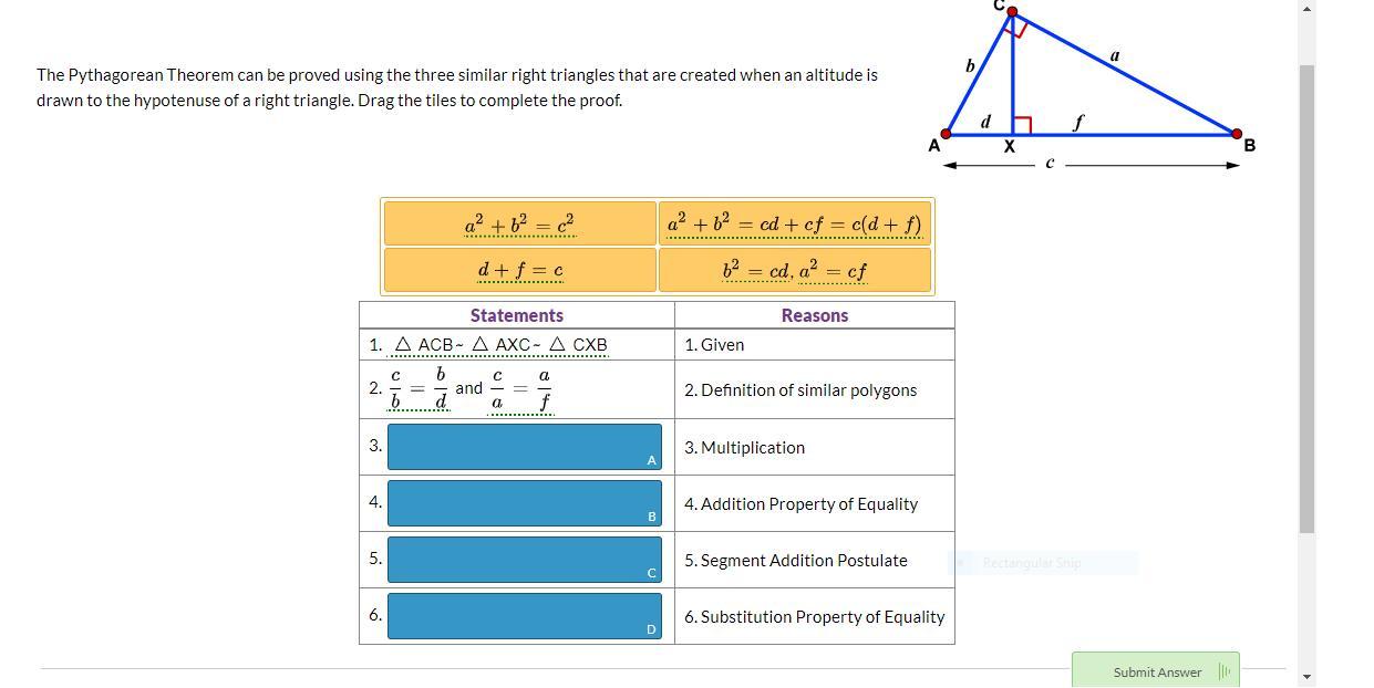 This is Statement 5, given to us through the Segment addition postulate. Finally, we can use our equation from statement 5 to substitute f + d for c in our equation from Statement 4, giving us the Pythagorean theorem: