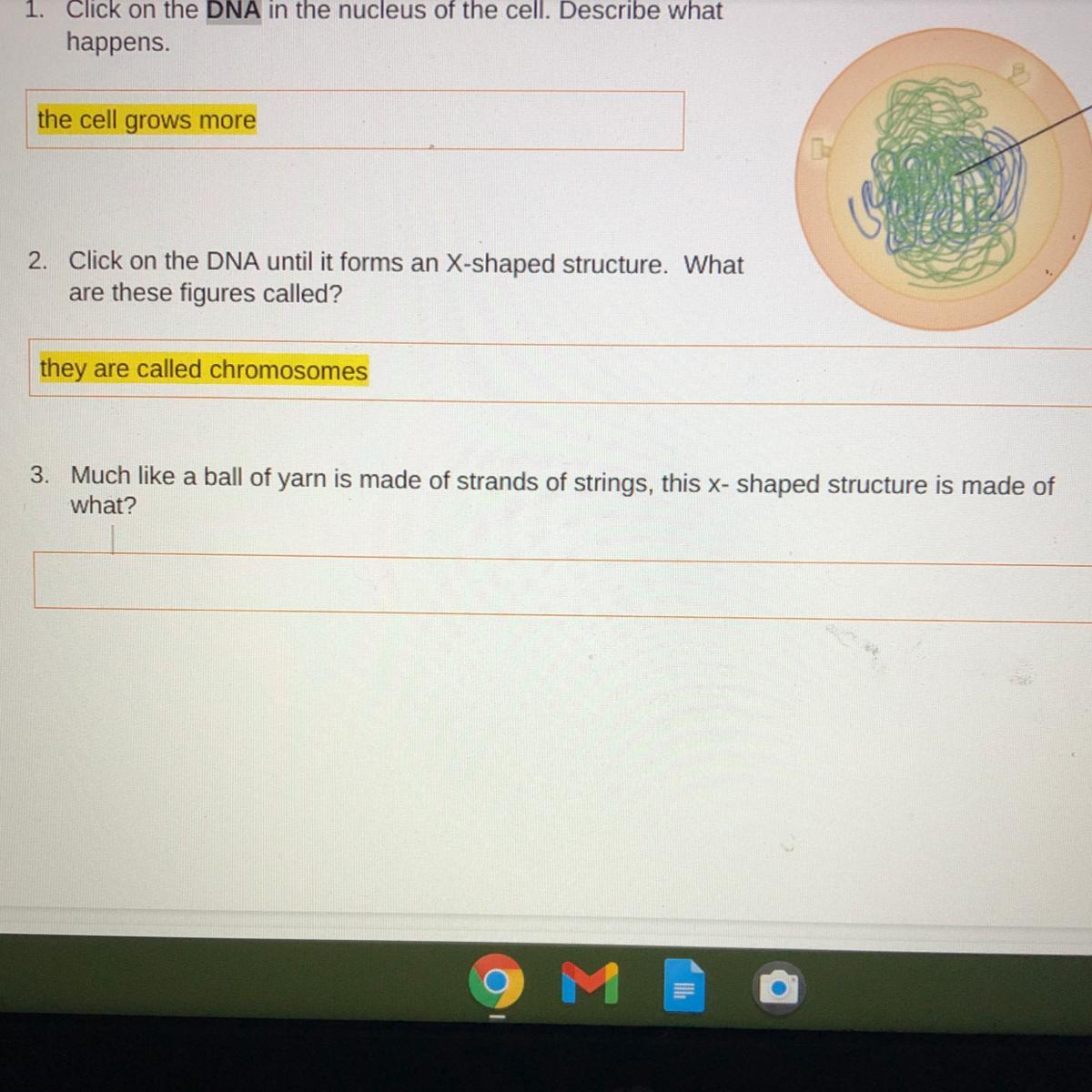 The chromosomes are thread-like structures located in the nucleus of each cell in the body. In a human cell, there are 23 pairs of chromosomes found in the nucleus. Each chromosome is made up of strands of DNA tightly coiled many times around proteins called histones which gives support to its structure.
