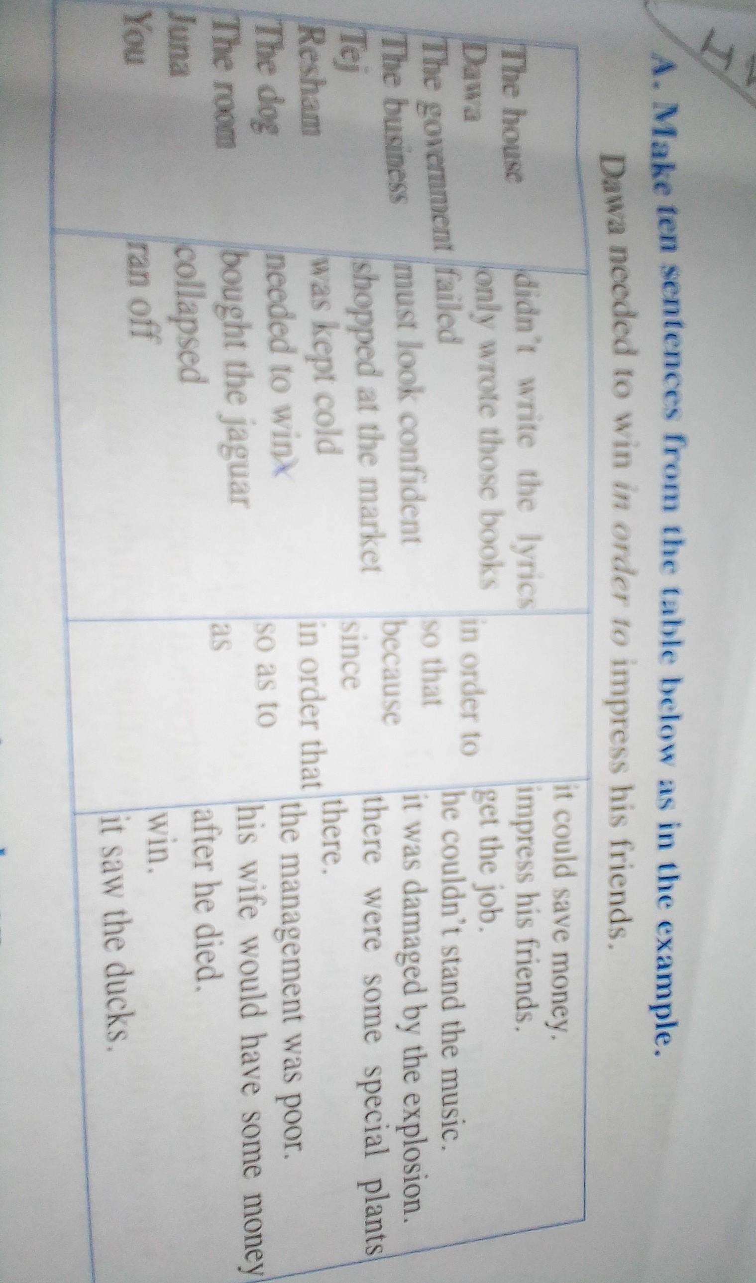 The phrases in the third column are actually giving reasons for what happens. For example, in sentence 2, one may ask: <em>Why does Dawa need to win</em>? Answer to that is: <u>In order to impress his friends.</u>
