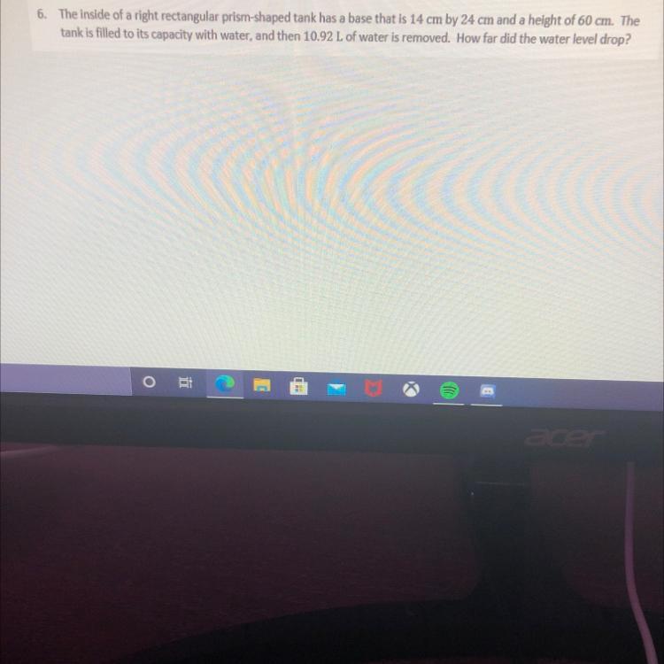 The inside of a right rectangular prism-shaped tank has a base that is 14 cm by 24 cm and a height of 60 cm. The